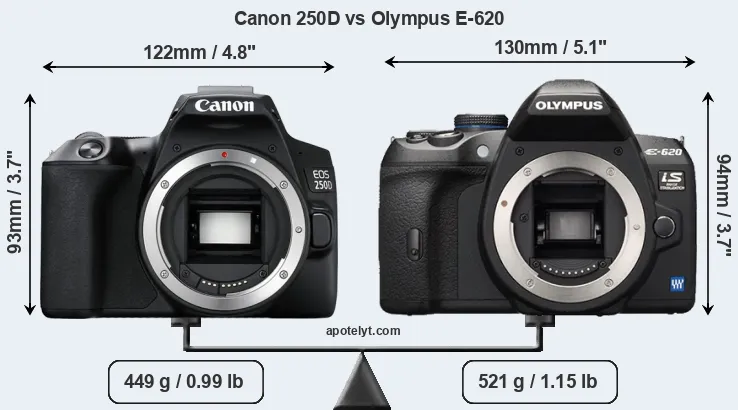 If the front view area (width x height) of the cameras is taken as an aggregate measure of their size, the Olympus E-620 is notably larger (8 percent) than the Canon 250D. Moreover, the E-620 is markedly heavier (16 percent) than the 250D. In this context, it is worth noting that neither the 250D nor the E-620 are weather-sealed.
