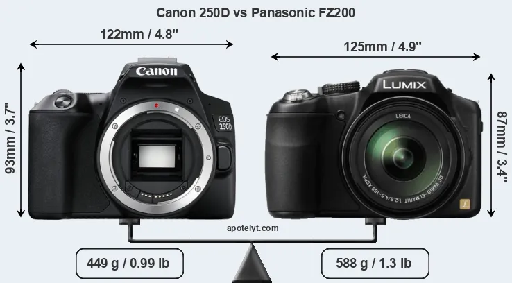The physical size and weight of the Canon 250D and the Panasonic FZ200 are illustrated in the side-by-side display below. The two cameras are presented according to their relative size. Three consecutive views from the front, the top, and the rear side are shown. All width, height and depth dimensions are rounded to the nearest millimeter.