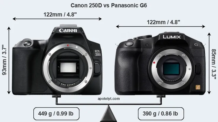 The physical size and weight of the Canon 250D and the Panasonic G6 are illustrated in the side-by-side display below. The two cameras are presented according to their relative size. Three consecutive views from the front, the top, and the rear side are shown. All size dimensions are rounded to the nearest millimeter.