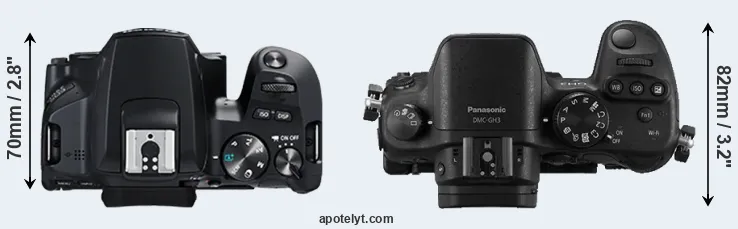 The side-by-side display below illustrates the physical size and weight of the Canon 250D and the Panasonic GH3. The two cameras are presented according to their relative size. Three consecutive views from the front, the top, and the rear side are shown. All width, height and depth dimensions are rounded to the nearest millimeter.