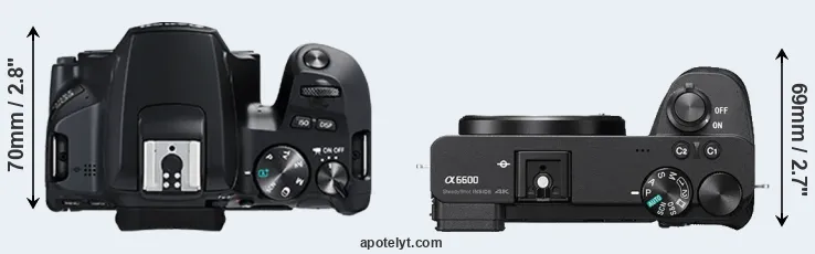 The physical size and weight of the Canon 250D and the Sony A6600 are illustrated in the side-by-side display below. The two cameras are presented according to their relative size. Three consecutive views from the front, the top, and the rear side are shown. All size dimensions are rounded to the nearest millimeter.