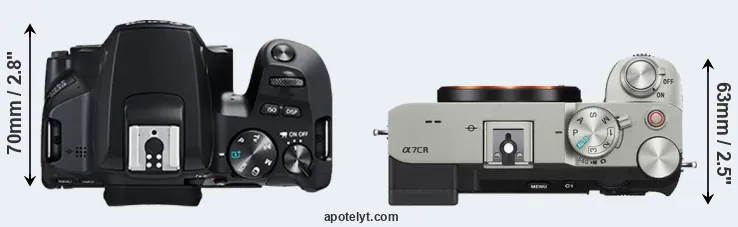 The Canon EOS 250D (called Canon SL3 in some regions) and the Sony Alpha A7C R are two digital cameras that were announced, respectively, in April 2019 and August 2023. The 250D is a DSLR, while the A7C R is a mirrorless interchangeable lens camera. The cameras are based on an APS-C (250D) and a full frame (A7C R) sensor. The Canon has a resolution of 24 megapixels, whereas the Sony provides 60.2 MP.