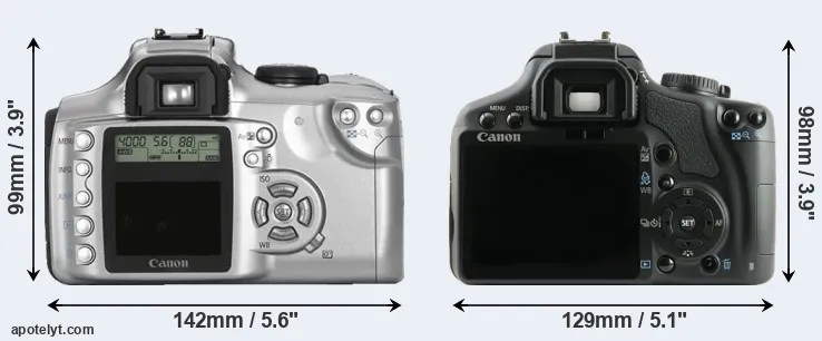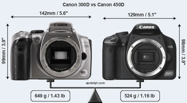 The physical size and weight of the Canon 300D and the Canon 450D are illustrated in the side-by-side display below. The two cameras are presented according to their relative size. Three successive views from the front, the top, and the rear are shown. All width, height and depth measures are rounded to the nearest millimeter.