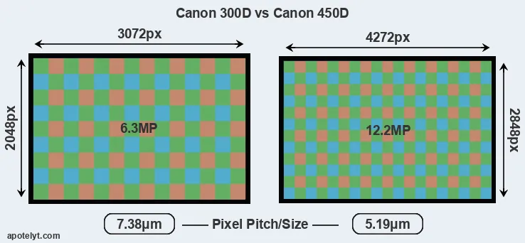 Despite having a slightly smaller sensor, the 450D offers a higher resolution of 12.2 megapixels, compared with 6.3 MP of the 300D. This megapixels advantage comes at the cost of a higher pixel density and a smaller size of the individual pixel (with a pixel pitch of 5.19μm versus 7.38μm for the 300D). However, it should be noted that the 450D is much more recent (by 4 years and 5 months) than the 300D, and its sensor will have benefitted from technological advances during this time that make it possible to gather light more efficiently.