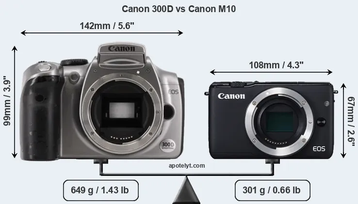 The side-by-side display below illustrates the physical size and weight of the Canon 300D and the Canon M10. The two cameras are presented according to their relative size. Three consecutive perspectives from the front, the top, and the back are available. All width, height and depth dimensions are rounded to the nearest millimeter.