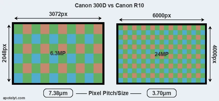 Despite having a slightly smaller sensor, the R10 offers a higher resolution of 24 megapixels, compared with 6.3 MP of the 300D. This megapixels advantage comes at the cost of a higher pixel density and a smaller size of the individual pixel (with a pixel pitch of 3.70μm versus 7.38μm for the 300D). However, it should be noted that the R10 is much more recent (by 18 years and 9 months) than the 300D, and its sensor will have benefitted from technological advances during this time that make it possible to gather light more efficiently.