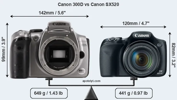 The side-by-side display below illustrates the physical size and weight of the Canon 300D and the Canon SX520. The two cameras are presented according to their relative size. Three consecutive perspectives from the front, the top, and the back are available. All width, height and depth measures are rounded to the nearest millimeter.
