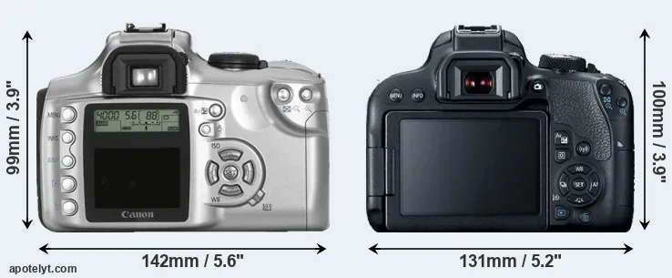 The side-by-side display below illustrates the physical size and weight of the Canon 300D and the Canon T7i. The two cameras are presented according to their relative size. Three consecutive views from the front, the top, and the rear side are shown. All width, height and depth dimensions are rounded to the nearest millimeter.