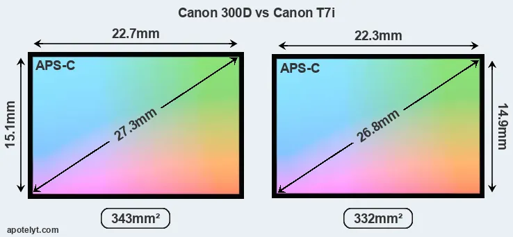 Despite having a slightly smaller sensor, the T7i offers a higher resolution of 24 megapixels, compared with 6.3 MP of the 300D. This megapixels advantage comes at the cost of a higher pixel density and a smaller size of the individual pixel (with a pixel pitch of 3.72μm versus 7.38μm for the 300D). However, it should be noted that the T7i is much more recent (by 13 years and 6 months) than the 300D, and its sensor will have benefitted from technological advances during this time that make it possible to gather light more efficiently.