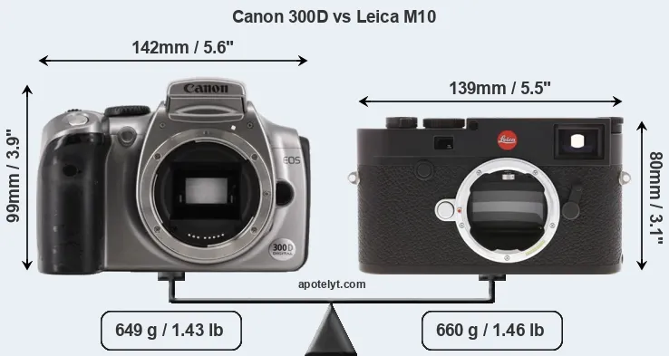 If the front view area (width x height) of the cameras is taken as an aggregate measure of their size, the Leica M10 is notably smaller (21 percent) than the Canon 300D. However, the M10 is slightly heavier (2 percent) than the 300D. It is noteworthy in this context that the M10 is splash and dust-proof, while the 300D does not feature any corresponding weather-sealing.