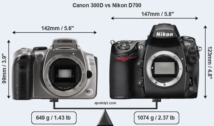 The side-by-side display below illustrates the physical size and weight of the Canon 300D and the Nikon D700. The two cameras are presented according to their relative size. Three consecutive perspectives from the front, the top, and the back are available. All size dimensions are rounded to the nearest millimeter.