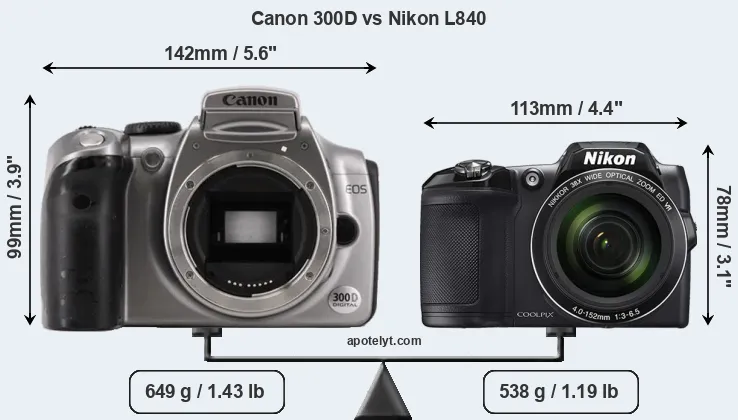If the front view area (width x height) of the cameras is taken as an aggregate measure of their size, the Nikon L840 is considerably smaller (37 percent) than the Canon 300D. In this context, it is worth noting that neither the 300D nor the L840 are weather-sealed.