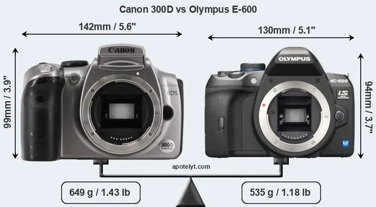 If the front view area (width x height) of the cameras is taken as an aggregate measure of their size, the Olympus E-600 is notably smaller (13 percent) than the Canon 300D. Moreover, the E-600 is markedly lighter (18 percent) than the 300D. In this context, it is worth noting that neither the 300D nor the E-600 are weather-sealed.