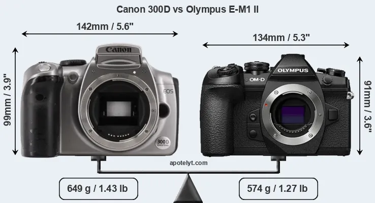 An illustration of the physical size and weight of the Canon 300D and the Olympus E-M1 II is provided in the side-by-side display below. The two cameras are presented according to their relative size. Three successive views from the front, the top, and the rear are shown. All width, height and depth dimensions are rounded to the nearest millimeter.