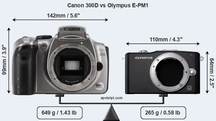 An illustration of the physical size and weight of the Canon 300D and the Olympus E-PM1 is provided in the side-by-side display below. The two cameras are presented according to their relative size. Three consecutive views from the front, the top, and the rear side are shown. All width, height and depth dimensions are rounded to the nearest millimeter.