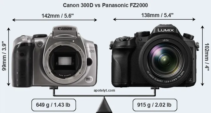 The side-by-side display below illustrates the physical size and weight of the Canon 300D and the Panasonic FZ2000. The two cameras are presented according to their relative size. Three consecutive perspectives from the front, the top, and the back are available. All width, height and depth measures are rounded to the nearest millimeter.