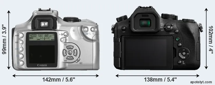 Going beyond this snapshot of core features and characteristics, what are the differences between the Canon EOS 300D and the Panasonic Lumix DMC-FZ2000? Which one should you buy? Read on to find out how these two cameras compare with respect to their body size, their imaging sensors, their shooting features, their input-output connections, and their reception by expert reviewers.