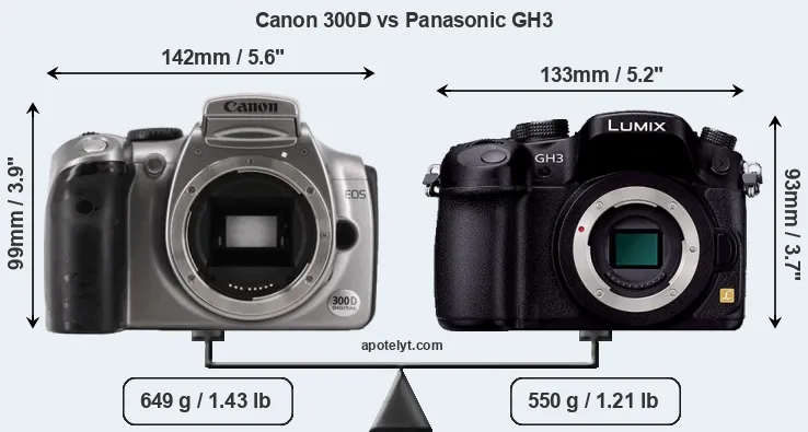 An illustration of the physical size and weight of the Canon 300D and the Panasonic GH3 is provided in the side-by-side display below. The two cameras are presented according to their relative size. Three successive views from the front, the top, and the rear are shown. All width, height and depth dimensions are rounded to the nearest millimeter.