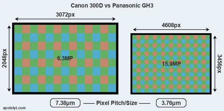Despite having a smaller sensor, the GH3 offers a higher resolution of 15.9 megapixels, compared with 6.3 MP of the 300D. This megapixels advantage comes at the cost of a higher pixel density and a smaller size of the individual pixel (with a pixel pitch of 3.76μm versus 7.38μm for the 300D). However, it should be noted that the GH3 is much more recent (by 9 years and 1 month) than the 300D, and its sensor will have benefitted from technological advances during this time that make it possible to gather light more efficiently.