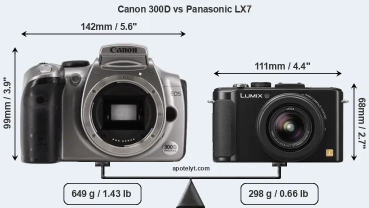 If the front view area (width x height) of the cameras is taken as an aggregate measure of their size, the Panasonic LX7 is considerably smaller (46 percent) than the Canon 300D. In this context, it is worth noting that neither the 300D nor the LX7 are weather-sealed.
