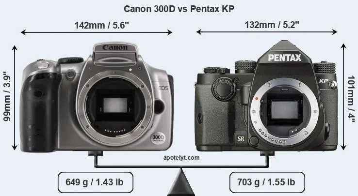 If the front view area (width x height) of the cameras is taken as an aggregate measure of their size, the Pentax KP is notably smaller (5 percent) than the Canon 300D. However, the KP is markedly heavier (8 percent) than the 300D. It is noteworthy in this context that the KP is splash and dust-proof, while the 300D does not feature any corresponding weather-sealing.