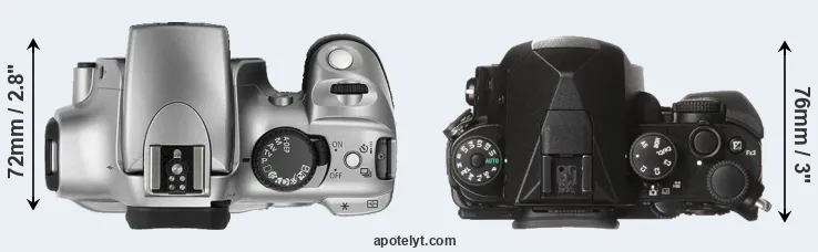 Going beyond this snapshot of core features and characteristics, what are the differences between the Canon EOS 300D and the Pentax KP? Which one should you buy? Read on to find out how these two cameras compare with respect to their body size, their imaging sensors, their shooting features, their input-output connections, and their reception by expert reviewers.