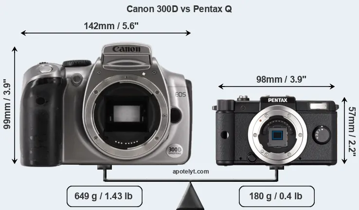 The physical size and weight of the Canon 300D and the Pentax Q are illustrated in the side-by-side display below. The two cameras are presented according to their relative size. Three consecutive perspectives from the front, the top, and the back are available. All width, height and depth dimensions are rounded to the nearest millimeter.