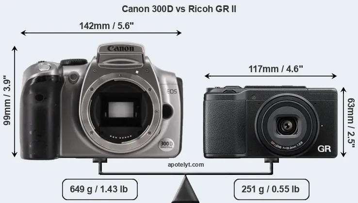 An illustration of the physical size and weight of the Canon 300D and the Ricoh GR II is provided in the side-by-side display below. The two cameras are presented according to their relative size. Three consecutive views from the front, the top, and the rear side are shown. All width, height and depth measures are rounded to the nearest millimeter.