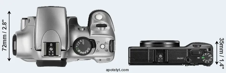 The above size and weight comparisons are to some extent incomplete and possibly misleading, as the GR II has a lens built in, whereas the 300D is an interchangeable lens camera that requires a separate lens. Attaching the latter will add extra weight and bulk to the setup. You can compare the optics available for the 300D and their specifications in the Canon EF Lens Catalog.