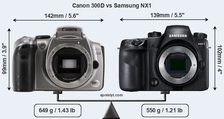 If the front view area (width x height) of the cameras is taken as an aggregate measure of their size, the Canon 300D and the Samsung NX1 are of equal size. However, the NX1 is markedly lighter (15 percent) than the 300D. It is noteworthy in this context that the NX1 is splash and dust-proof, while the 300D does not feature any corresponding weather-sealing.