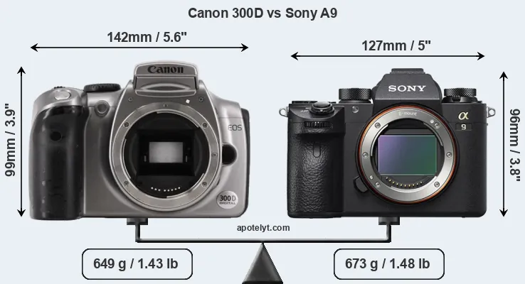 If the front view area (width x height) of the cameras is taken as an aggregate measure of their size, the Sony A9 is notably smaller (13 percent) than the Canon 300D. However, the A9 is slightly heavier (4 percent) than the 300D. It is noteworthy in this context that the A9 is splash and dust-proof, while the 300D does not feature any corresponding weather-sealing.