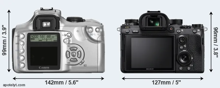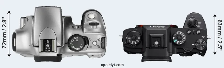 The physical size and weight of the Canon 300D and the Sony A9 are illustrated in the side-by-side display below. The two cameras are presented according to their relative size. Three successive views from the front, the top, and the rear are shown. All size dimensions are rounded to the nearest millimeter.