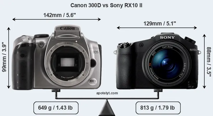The above size and weight comparisons are to some extent incomplete and possibly misleading, as the RX10 II has a lens built in, whereas the 300D is an interchangeable lens camera that requires a separate lens. Attaching the latter will add extra weight and bulk to the setup. You can compare the optics available for the 300D and their specifications in the Canon EF Lens Catalog.