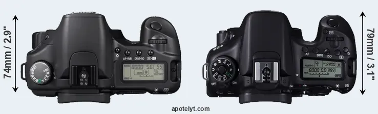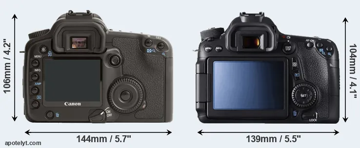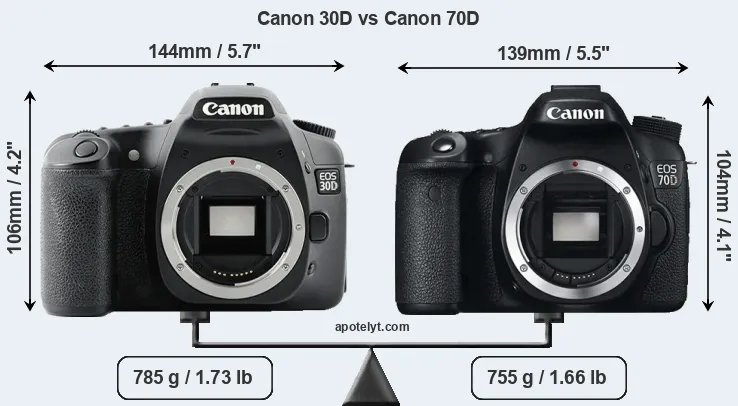 The side-by-side display below illustrates the physical size and weight of the Canon 30D and the Canon 70D. The two cameras are presented according to their relative size. Three successive views from the front, the top, and the rear are shown. All width, height and depth measures are rounded to the nearest millimeter.
