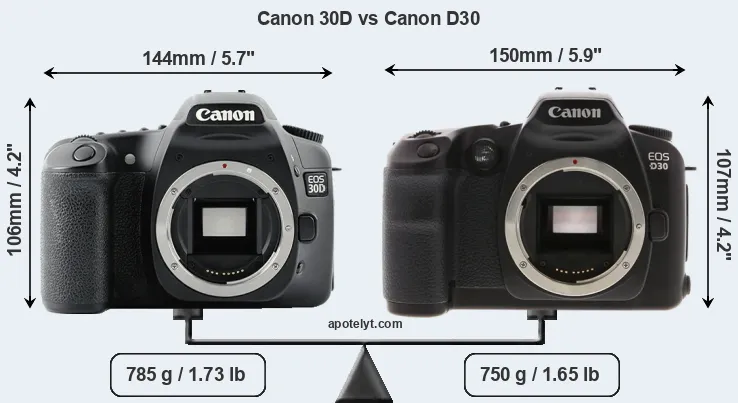 An illustration of the physical size and weight of the Canon 30D and the Canon D30 is provided in the side-by-side display below. The two cameras are presented according to their relative size. Three consecutive perspectives from the front, the top, and the back are available. All width, height and depth dimensions are rounded to the nearest millimeter.