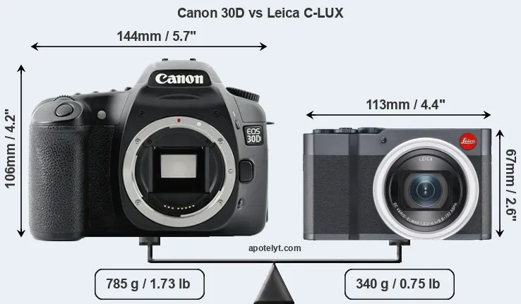 The above size and weight comparisons are to some extent incomplete and possibly misleading, as the C-LUX has a lens built in, whereas the 30D is an interchangeable lens camera that requires a separate lens. Attaching the latter will add extra weight and bulk to the setup. You can compare the optics available for the 30D and their specifications in the Canon EF Lens Catalog.
