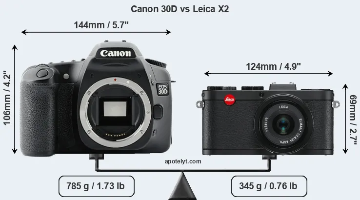 If the front view area (width x height) of the cameras is taken as an aggregate measure of their size, the Leica X2 is considerably smaller (44 percent) than the Canon 30D. In this context, it is worth noting that neither the 30D nor the X2 are weather-sealed.