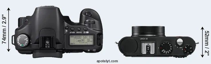 The physical size and weight of the Canon 30D and the Leica X2 are illustrated in the side-by-side display below. The two cameras are presented according to their relative size. Three consecutive views from the front, the top, and the rear side are shown. All size dimensions are rounded to the nearest millimeter.
