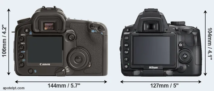 The physical size and weight of the Canon 30D and the Nikon D5000 are illustrated in the side-by-side display below. The two cameras are presented according to their relative size. Three consecutive views from the front, the top, and the rear side are shown. All width, height and depth measures are rounded to the nearest millimeter.