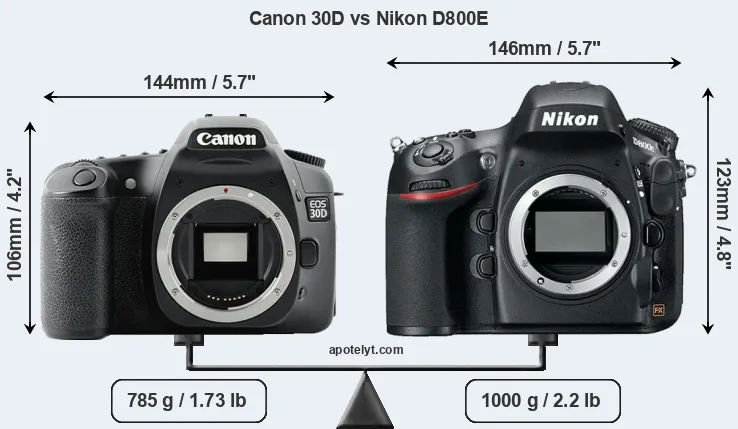 An illustration of the physical size and weight of the Canon 30D and the Nikon D800E is provided in the side-by-side display below. The two cameras are presented according to their relative size. Three successive views from the front, the top, and the rear are shown. All width, height and depth measures are rounded to the nearest millimeter.