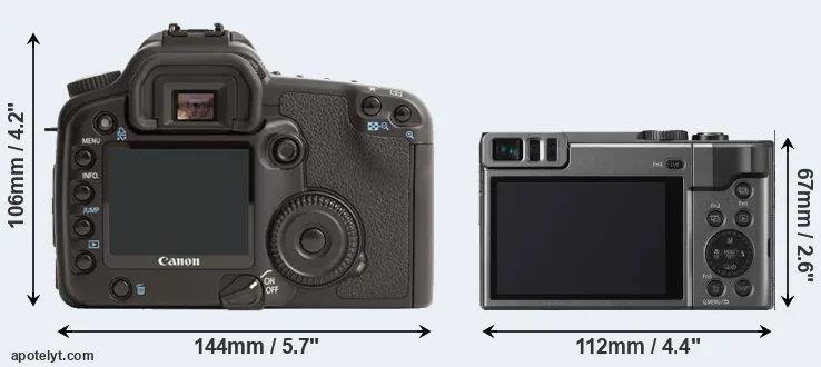 The side-by-side display below illustrates the physical size and weight of the Canon 30D and the Panasonic ZS70. The two cameras are presented according to their relative size. Three successive views from the front, the top, and the rear are shown. All size dimensions are rounded to the nearest millimeter.