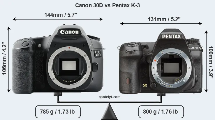 The physical size and weight of the Canon 30D and the Pentax K-3 are illustrated in the side-by-side display below. The two cameras are presented according to their relative size. Three successive views from the front, the top, and the rear are shown. All size dimensions are rounded to the nearest millimeter.