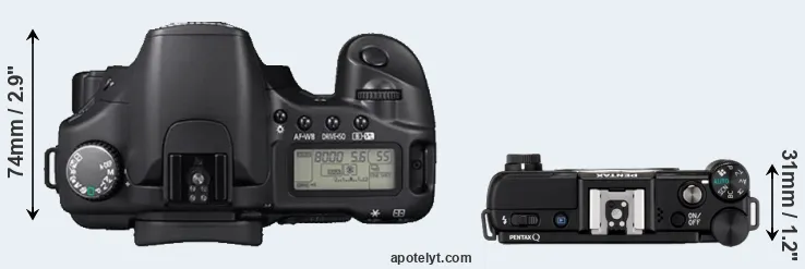 An illustration of the physical size and weight of the Canon 30D and the Pentax Q is provided in the side-by-side display below. The two cameras are presented according to their relative size. Three consecutive views from the front, the top, and the rear side are shown. All width, height and depth dimensions are rounded to the nearest millimeter.
