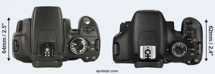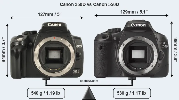 An illustration of the physical size and weight of the Canon 350D and the Canon 550D is provided in the side-by-side display below. The two cameras are presented according to their relative size. Three successive views from the front, the top, and the rear are shown. All width, height and depth dimensions are rounded to the nearest millimeter.