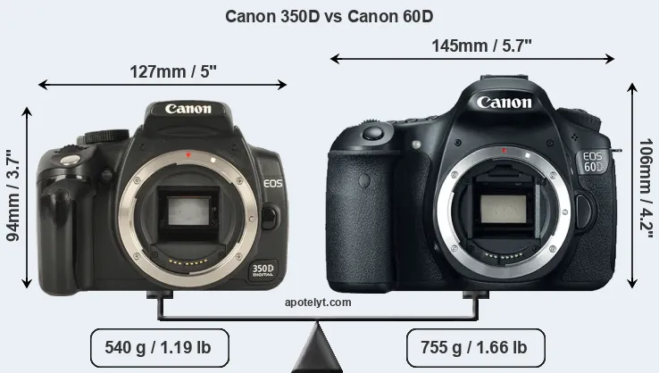 If the front view area (width x height) of the cameras is taken as an aggregate measure of their size, the Canon 60D is notably larger (29 percent) than the Canon 350D. Moreover, the 60D is substantially heavier (40 percent) than the 350D. It is noteworthy in this context that the 60D is splash and dust-proof, while the 350D does not feature any corresponding weather-sealing.
