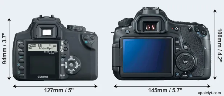 The physical size and weight of the Canon 350D and the Canon 60D are illustrated in the side-by-side display below. The two cameras are presented according to their relative size. Three consecutive views from the front, the top, and the rear side are shown. All width, height and depth dimensions are rounded to the nearest millimeter.