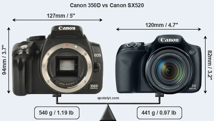 The physical size and weight of the Canon 350D and the Canon SX520 are illustrated in the side-by-side display below. The two cameras are presented according to their relative size. Three successive views from the front, the top, and the rear are shown. All width, height and depth measures are rounded to the nearest millimeter.