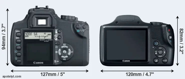 Going beyond this snapshot of core features and characteristics, what are the differences between the Canon EOS 350D and the Canon PowerShot SX520 HS? Which one should you buy? Read on to find out how these two cameras compare with respect to their body size, their imaging sensors, their shooting features, their input-output connections, and their reception by expert reviewers.