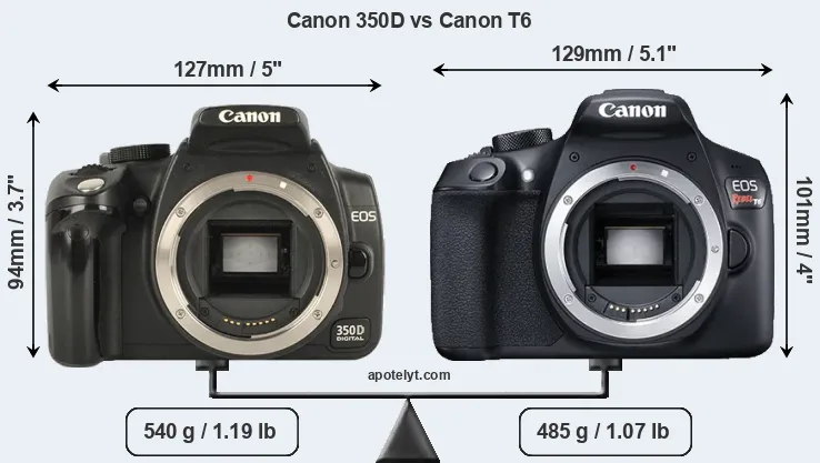 If the front view area (width x height) of the cameras is taken as an aggregate measure of their size, the Canon T6 is notably larger (9 percent) than the Canon 350D. However, the T6 is markedly lighter (10 percent) than the 350D. In this context, it is worth noting that neither the 350D nor the T6 are weather-sealed.