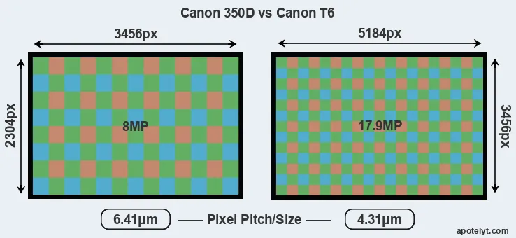 With 17.9MP, the T6 offers a higher resolution than the 350D (8MP), but the T6 has smaller individual pixels (pixel pitch of 4.31μm versus 6.41μm for the 350D). Yet, the T6 is a much more recent model (by 11 years) than the 350D, and its sensor will have benefitted from technological advances during this time that enhance the light gathering capacity of its pixel-units.